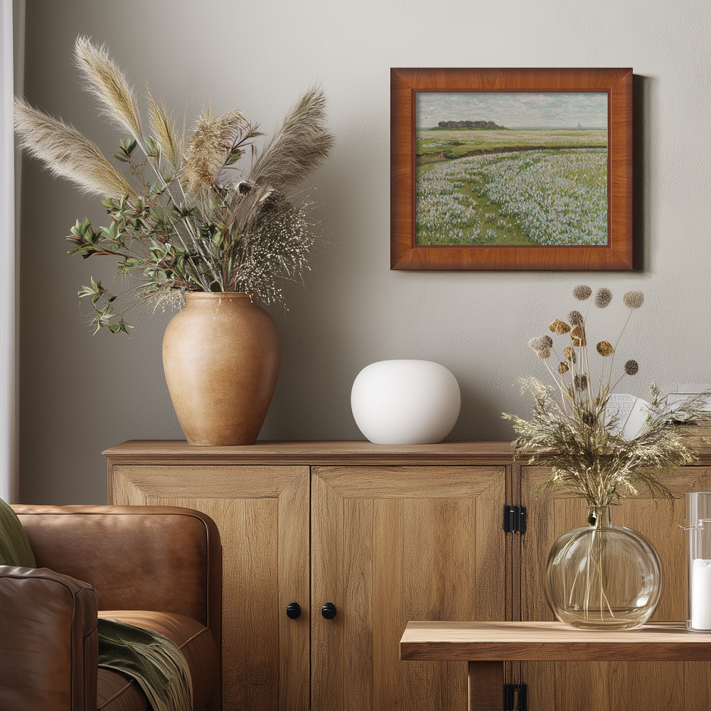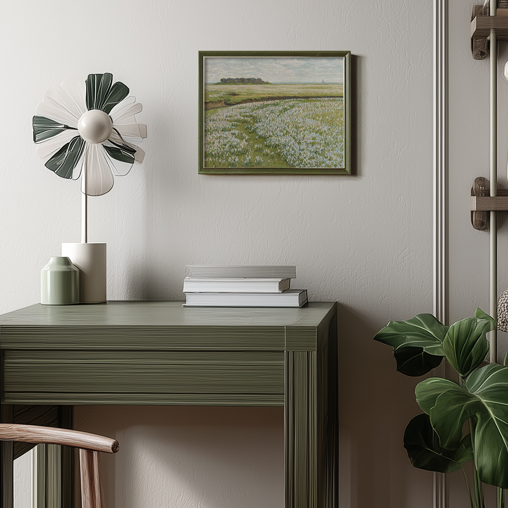 Coastal Wildflower Meadow with Distant Village and Sailboat