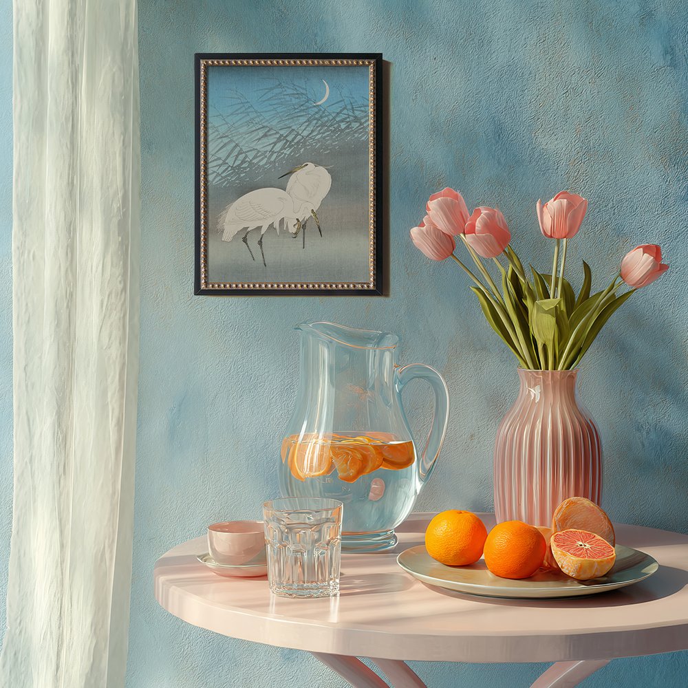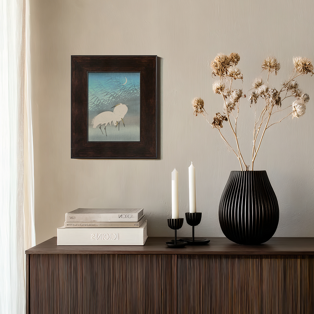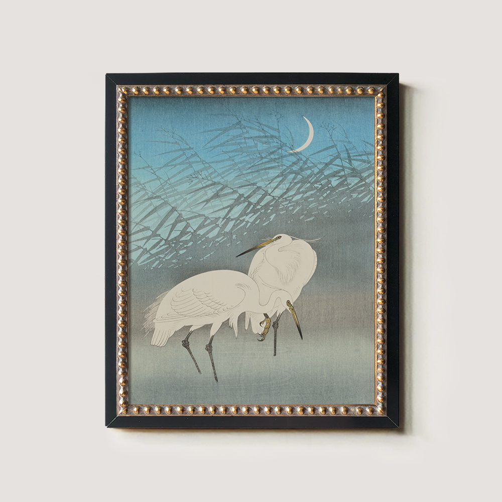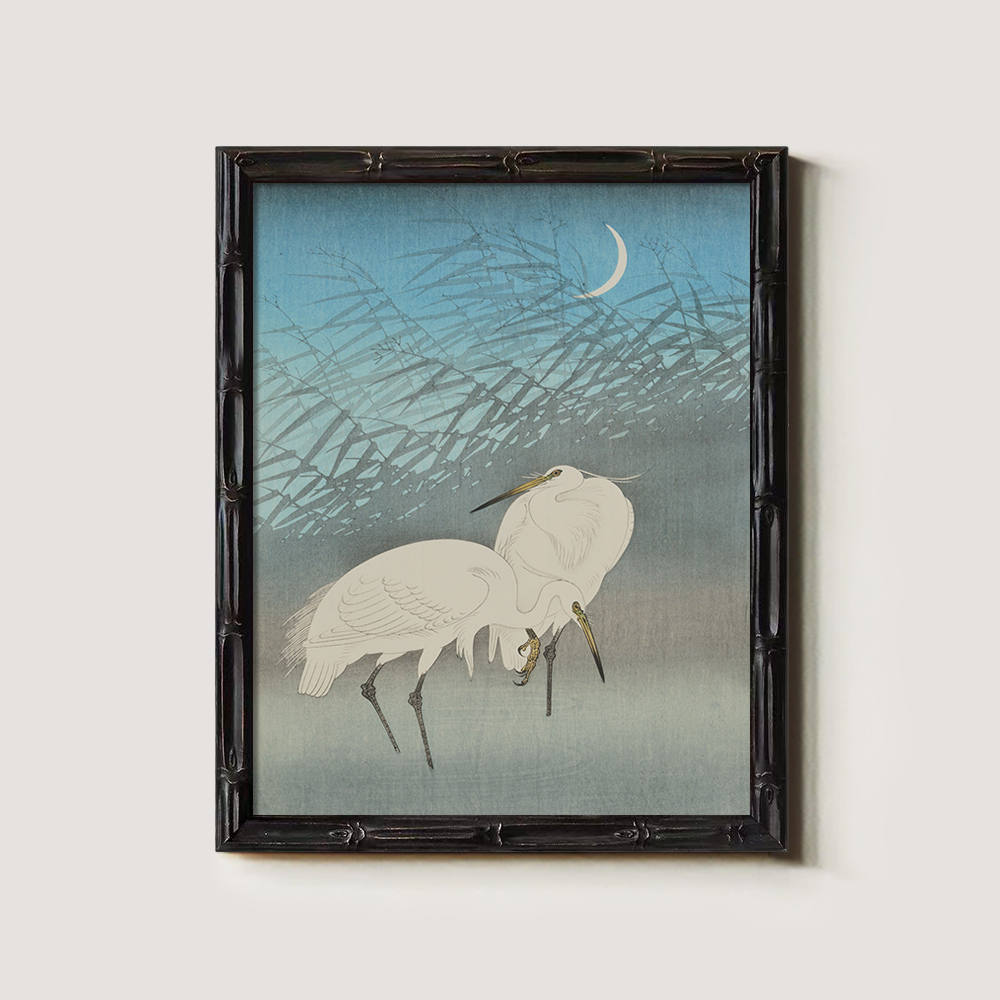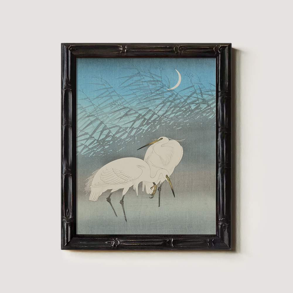 Moonlit Egrets in Reeds - Japanese Woodblock Reproduction